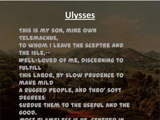 The speaker and content of Tennysons poem Ulysses are based on the ancient Greek epic poem the Odyssey 1616 by Homer. Making the reading experience fun. Ulysses Summary and Study Guide.